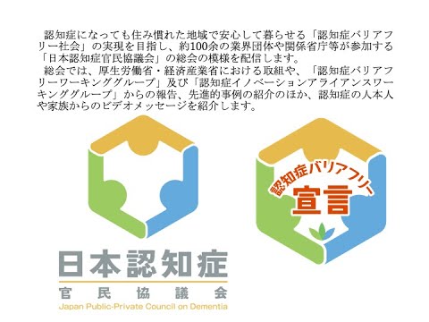 認知症になっても住み慣れた地域で安心して暮らせる「認知症バリアフリー社会」の実現を目指し、約100余の業界団体や関係省庁等が参加する「日本認知症官民協議会」の総会の模様を配信します。総会では、厚生労働省・経済産業省における取組や、「認知症バ...